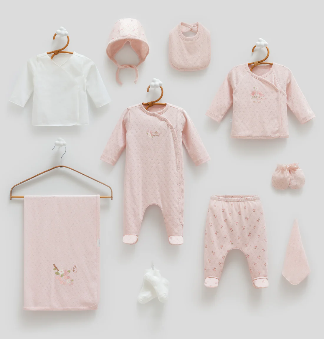 This is the soft pink version of the “Hello Spring” 10-piece hospital set. It combines the same delicate, nature-inspired illustrations with a warm pastel pink base, perfect for a cozy and feminine newborn look.