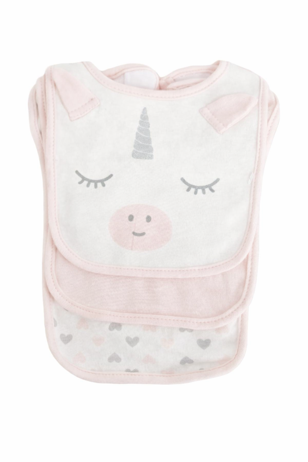 • Top Bib: Features a unicorn face with a sparkly silver horn, sleepy eyes, and small 3D fabric ears.