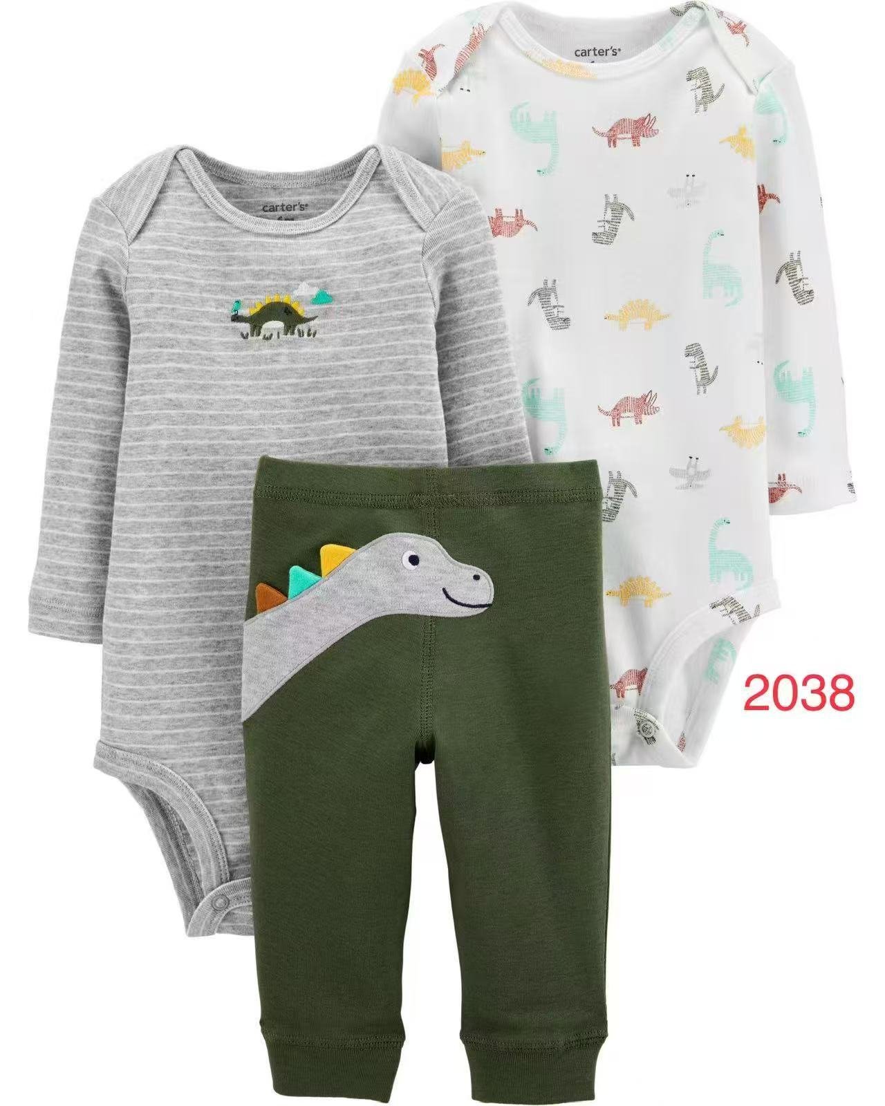 * Long-Sleeve Bodysuit: Blue and white micro-stripes with a small dinosaur embroidery on the chest.