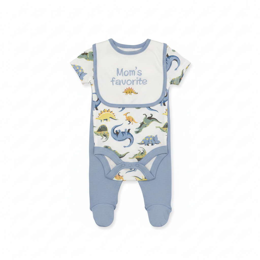 - Matching Bib: A white bib with a blue border, featuring the sweet phrase “Mom’s favorite” embroidered in the center with a small dinosaur detail.