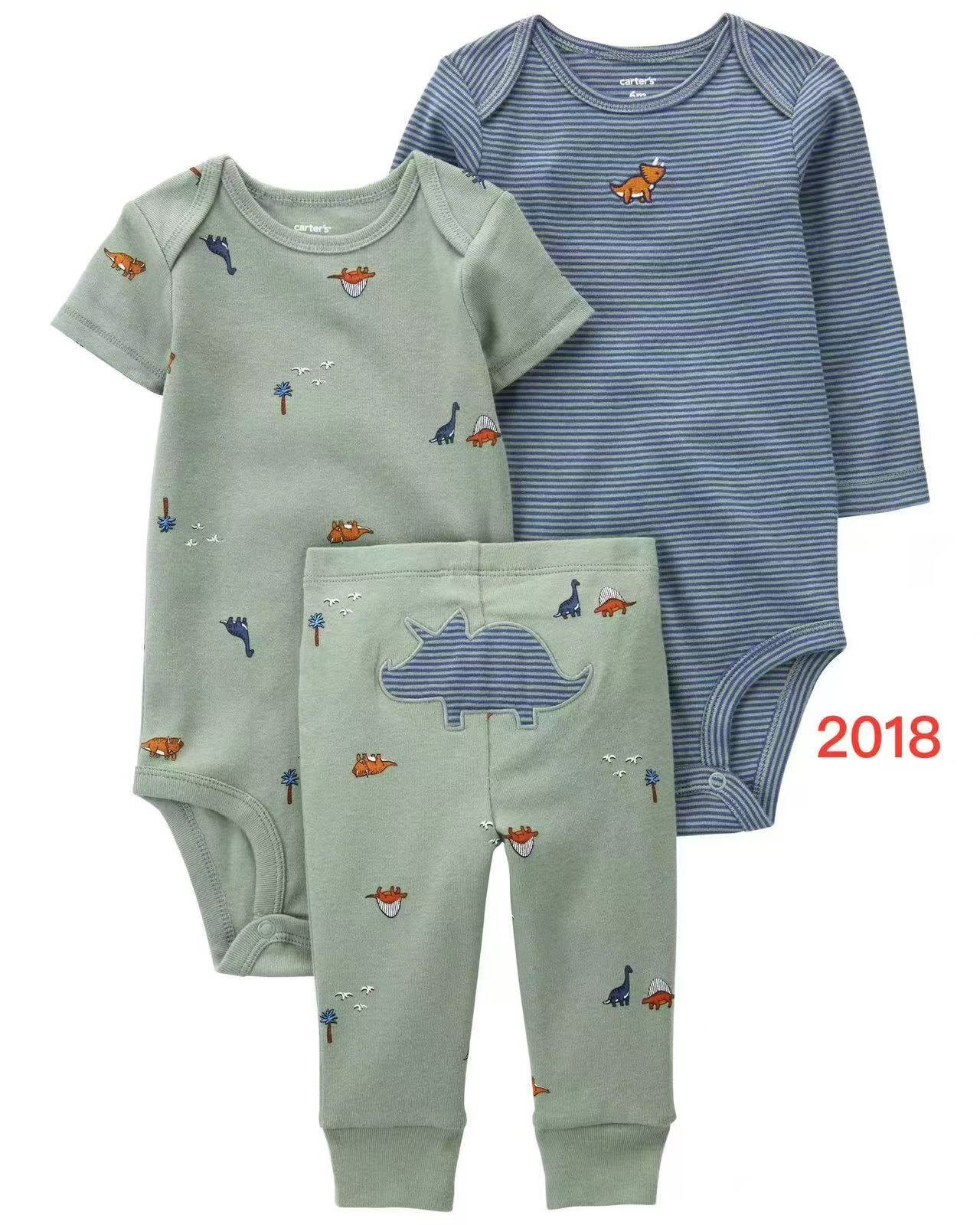 * Short-Sleeve Bodysuit: A sage green onesie featuring an all-over print of colorful dinosaurs, palm trees, and birds.