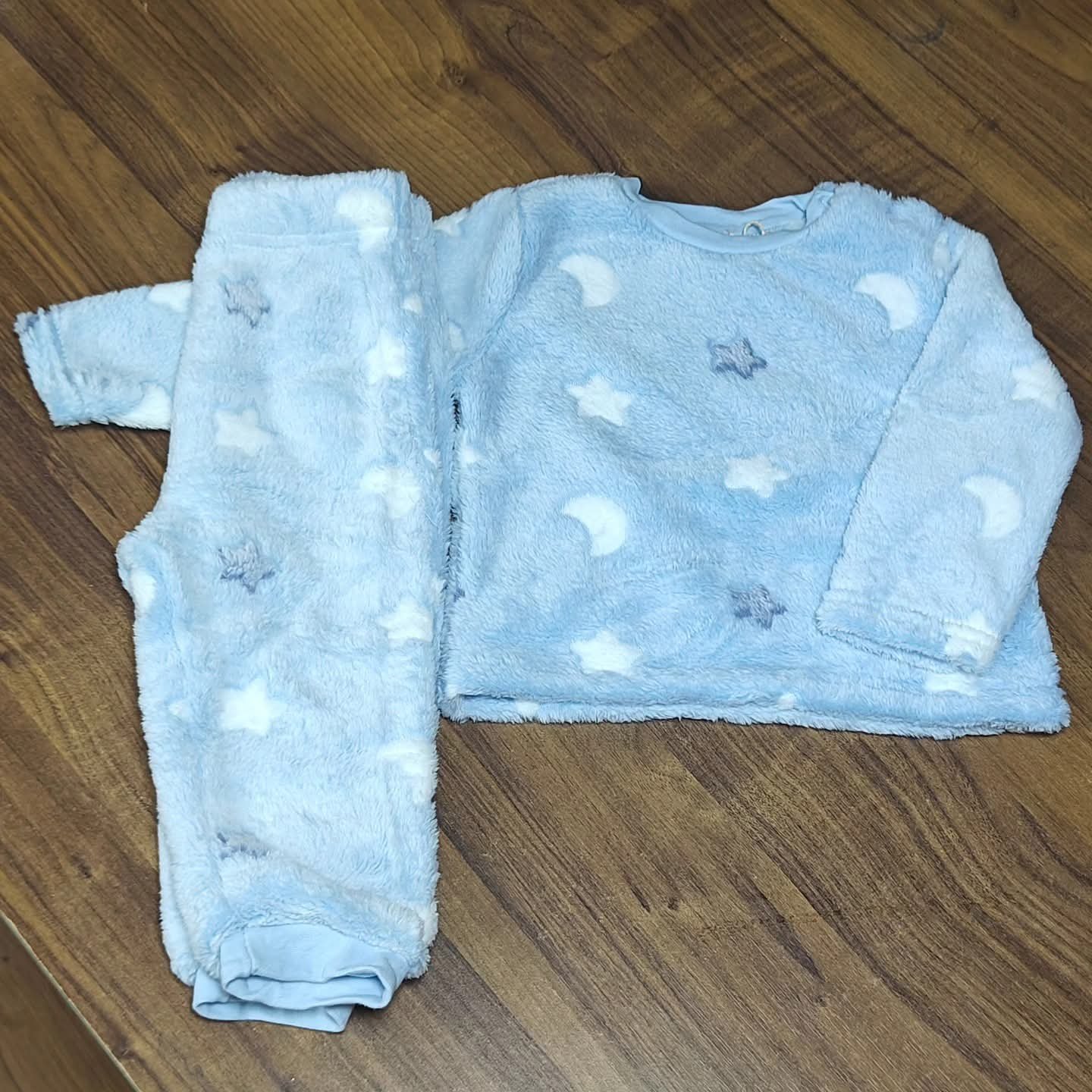 Keep your little one cozy and comfortable with this soft fleece pajama set. Designed with a light blue background and adorable moon and star prints, this two-piece set includes a long-sleeve top and matching pants. The plush fabric is gentle on delicate skin, providing warmth and comfort during cooler nights. Perfect for bedtime or lounging at home, this pajama set is both cute and practical for babies from 9 to 24 months.