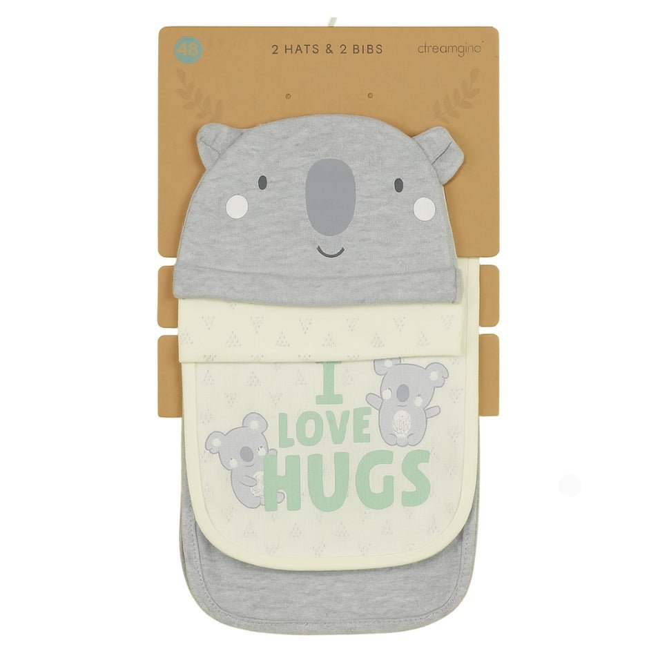 Bibs: One bib says “I LOVE HUGS” with illustrations of two small koalas, and the other is a plain grey bib.