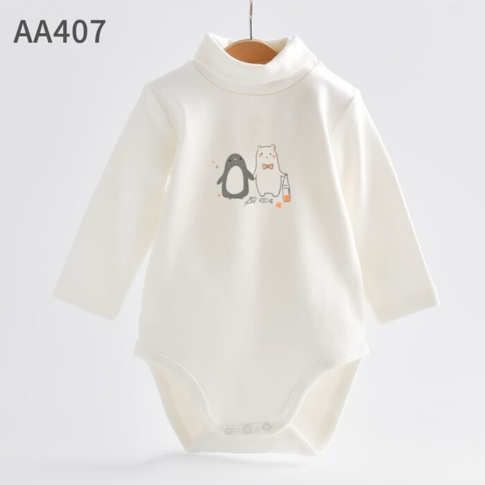 Keep your baby snug and stylish with this soft cream-colored long-sleeve bodysuit. Made from gentle, breathable cotton, it provides warmth and comfort for everyday wear. The front features an adorable penguin and bear illustration, adding a sweet and playful touch to the outfit.