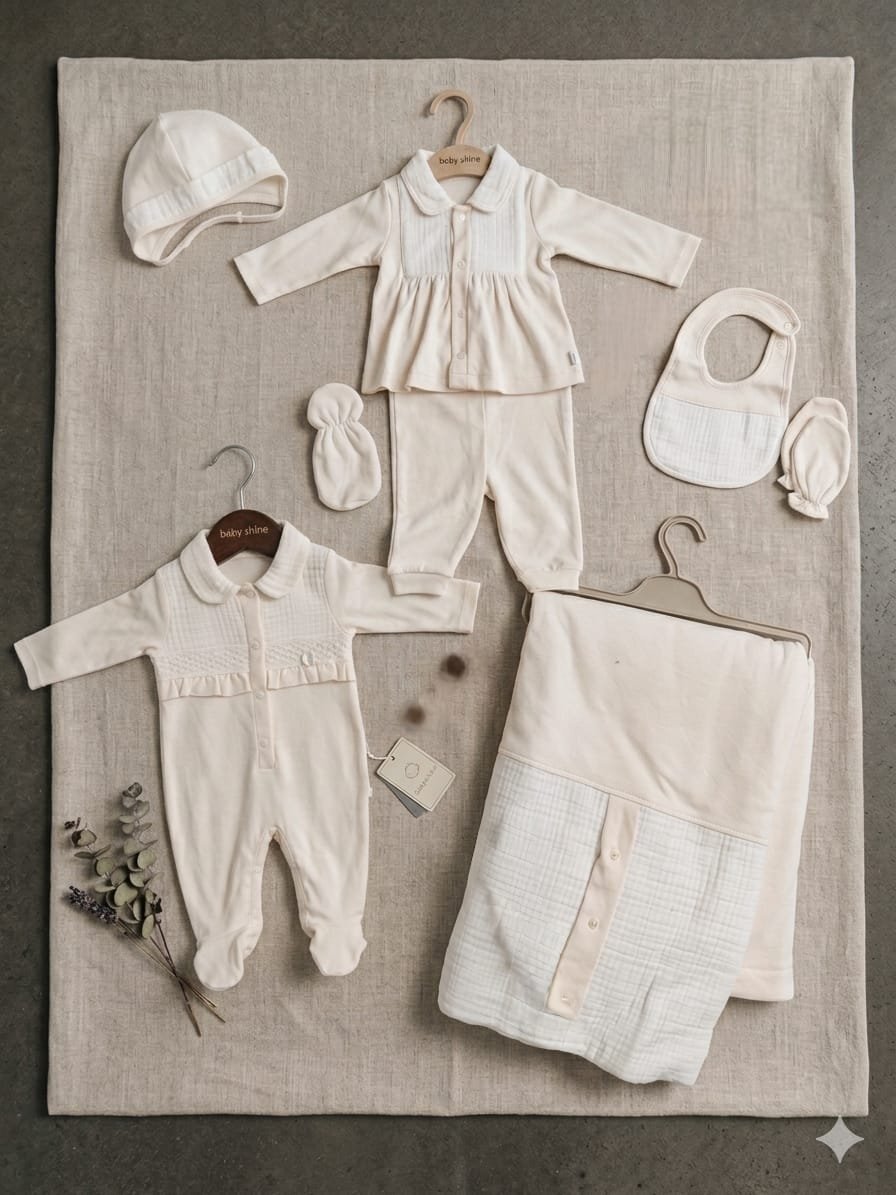 A soft and elegant baby clothing set in a light cream color. It includes a long-sleeve top, pants, a romper, a hat, mittens, a bib, and a cozy