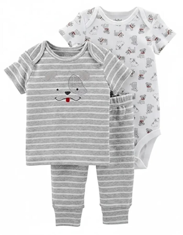 - Design: A white sleepsuit decorated with a tiny grey bow pattern and soft pink trim at the neck and cuffs.