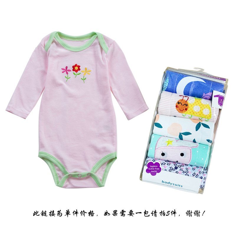 - Packaging: To the right is a transparent 5-pack retail set. The folded bodysuits inside show various colorful patterns, including a ladybug, floral prints, and a crescent moon.