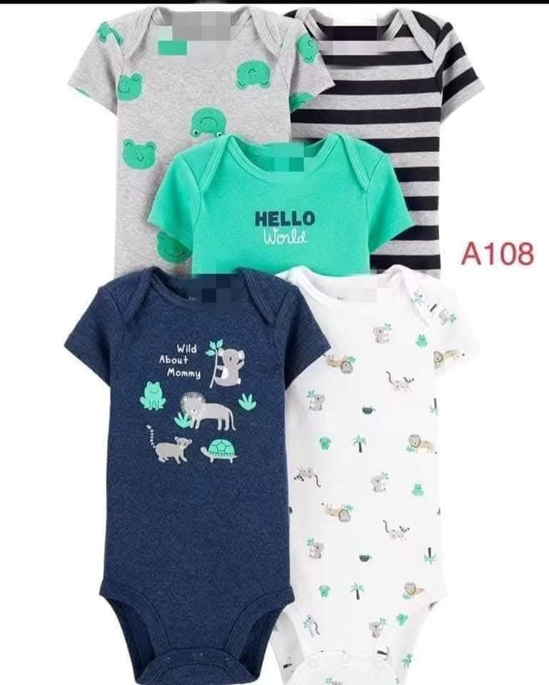 A set of five baby bodysuits with short sleeves.
