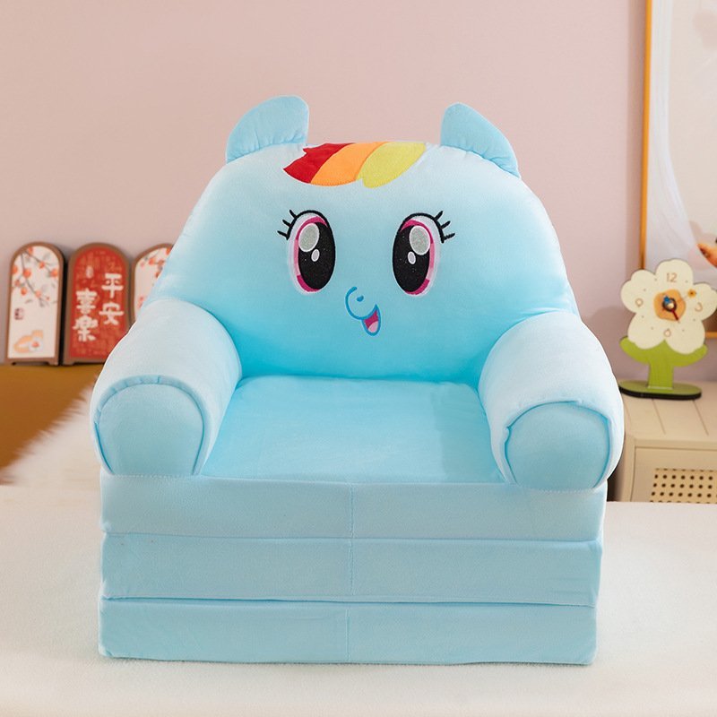 - Pony Design: A light blue chair featuring large expressive eyes, a small smile, and a colorful rainbow mane detail at the top.
