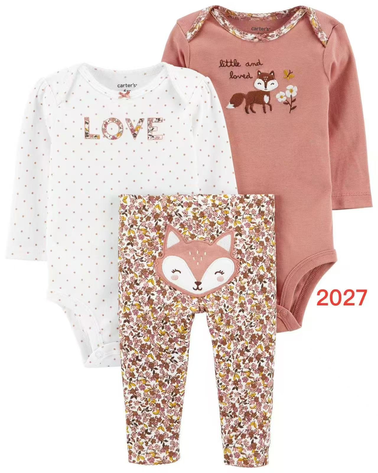 * Bodysuit 2: A rose-pink long-sleeve bodysuit with a “Little and Loved” fox graphic and floral trim.