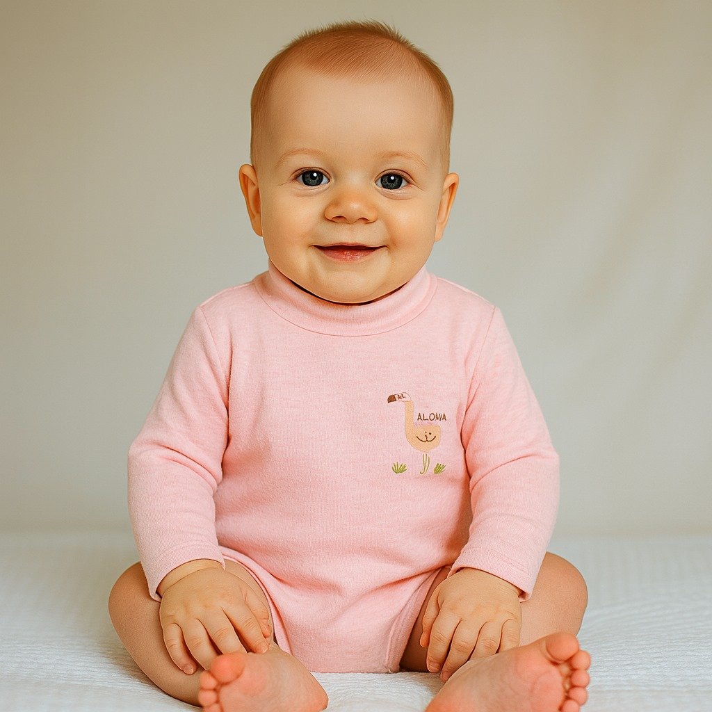 Wrap your little one in cozy comfort with this adorable pink high-neck cotton bodysuit. Designed with a thick, soft cotton fabric, it’s perfect for cooler weather, keeping your baby warm and snug all day. The turtleneck style adds an extra layer of warmth, while the two snap buttons on the shoulder make dressing and undressing easy and fuss-free.