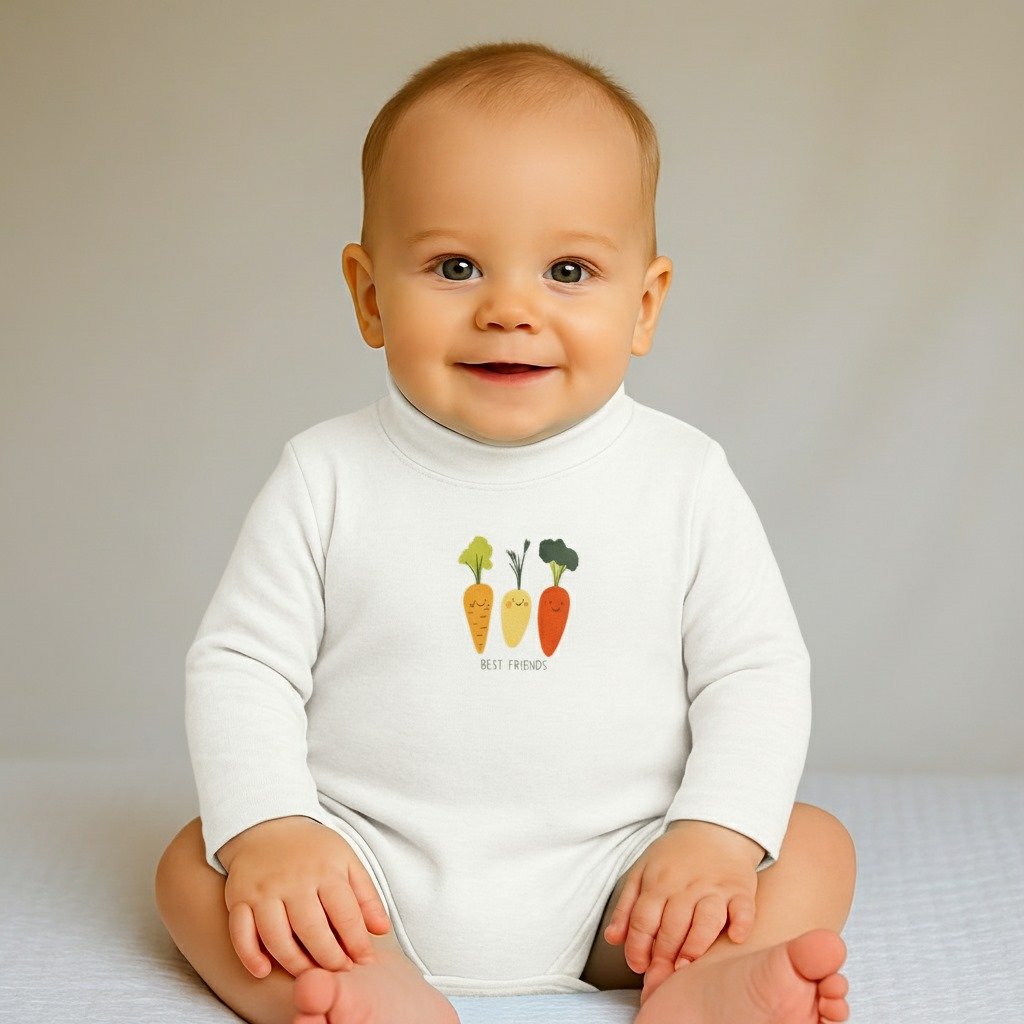 This cozy high-neck (turtleneck) bodysuit is crafted from thick, soft cotton, making it perfect for cooler days. It features two snap buttons on the shoulder for easy wear, long sleeves, and bottom snap closures for quick diaper changes. The front is decorated with a cute “Best Friends” veggie print, adding a fun and playful touch. Comfortable, practical, and adorable for everyday wear.