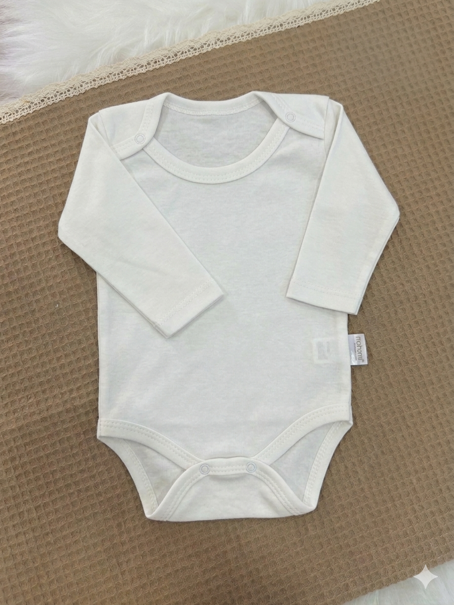 A soft, white baby bodysuit with long sleeves. It has snap buttons at the bottom for easy changing and a simple, comfortable