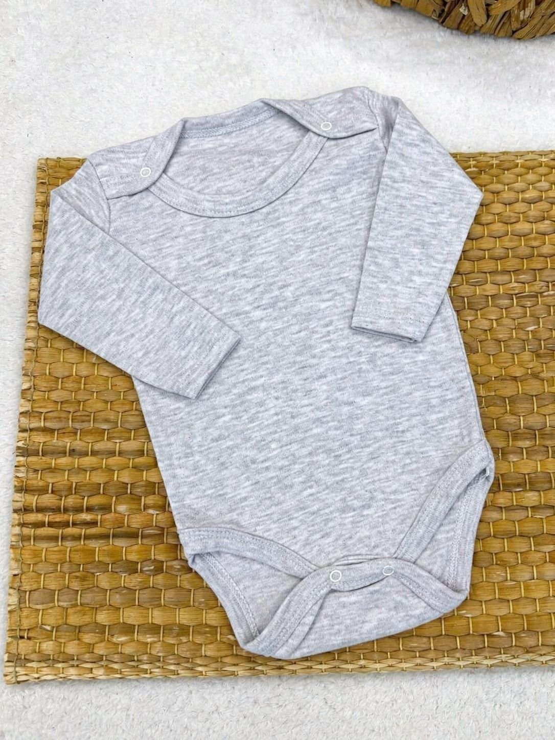 A soft, gray baby bodysuit with long sleeves. It has snap buttons at the bottom for easy changing and a simple, comfortable design.