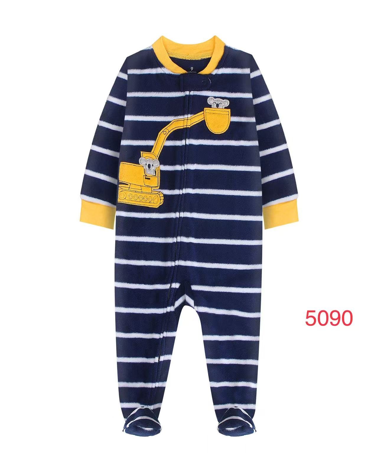 Keep your little one cozy and adorable in this soft fleece overall. Designed with navy blue and white horizontal stripes, it features cheerful yellow accents on the collar, cuffs, and feet. The cute excavator applique with koala characters adds a playful touch, perfect for everyday wear or bedtime. This footed sleeper ensures warmth from head to toe, while the front zipper makes dressing and diaper changes quick and easy.