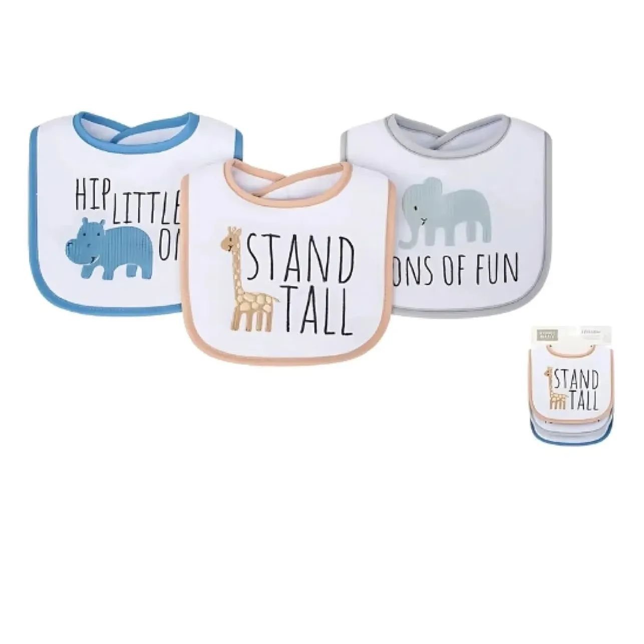Giraffe Bib: Features a tan giraffe with the phrase “Stand Tall.”