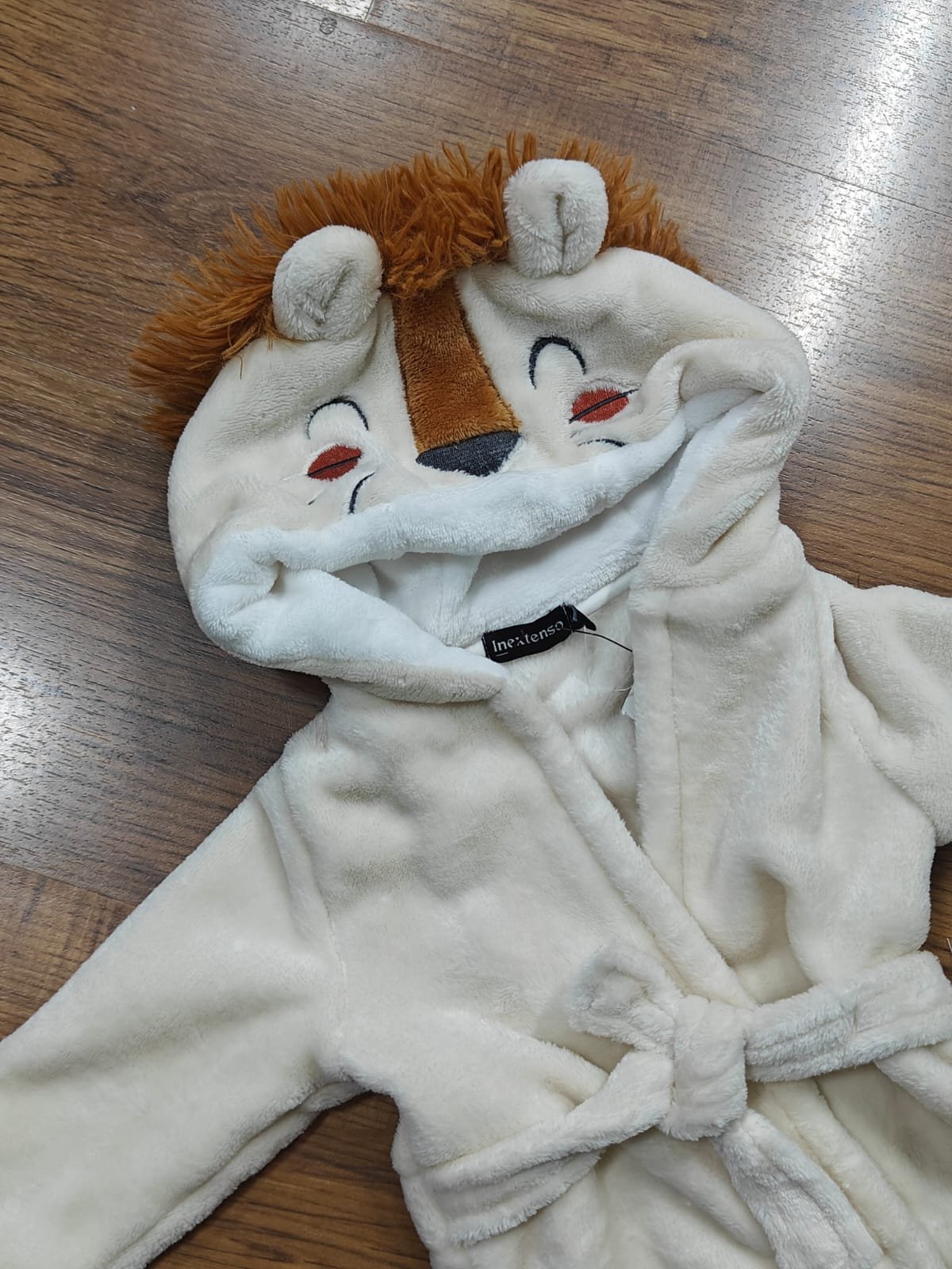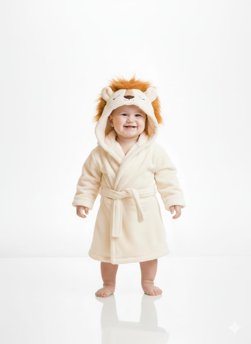 A wrap-around style robe in a soft cream/off-white color. It features a charming lion character hood complete with a faux-fur mane, 3D ears, and an embroidered friendly face.