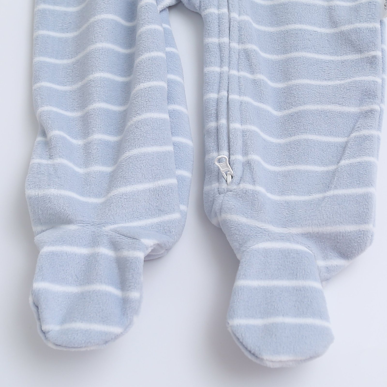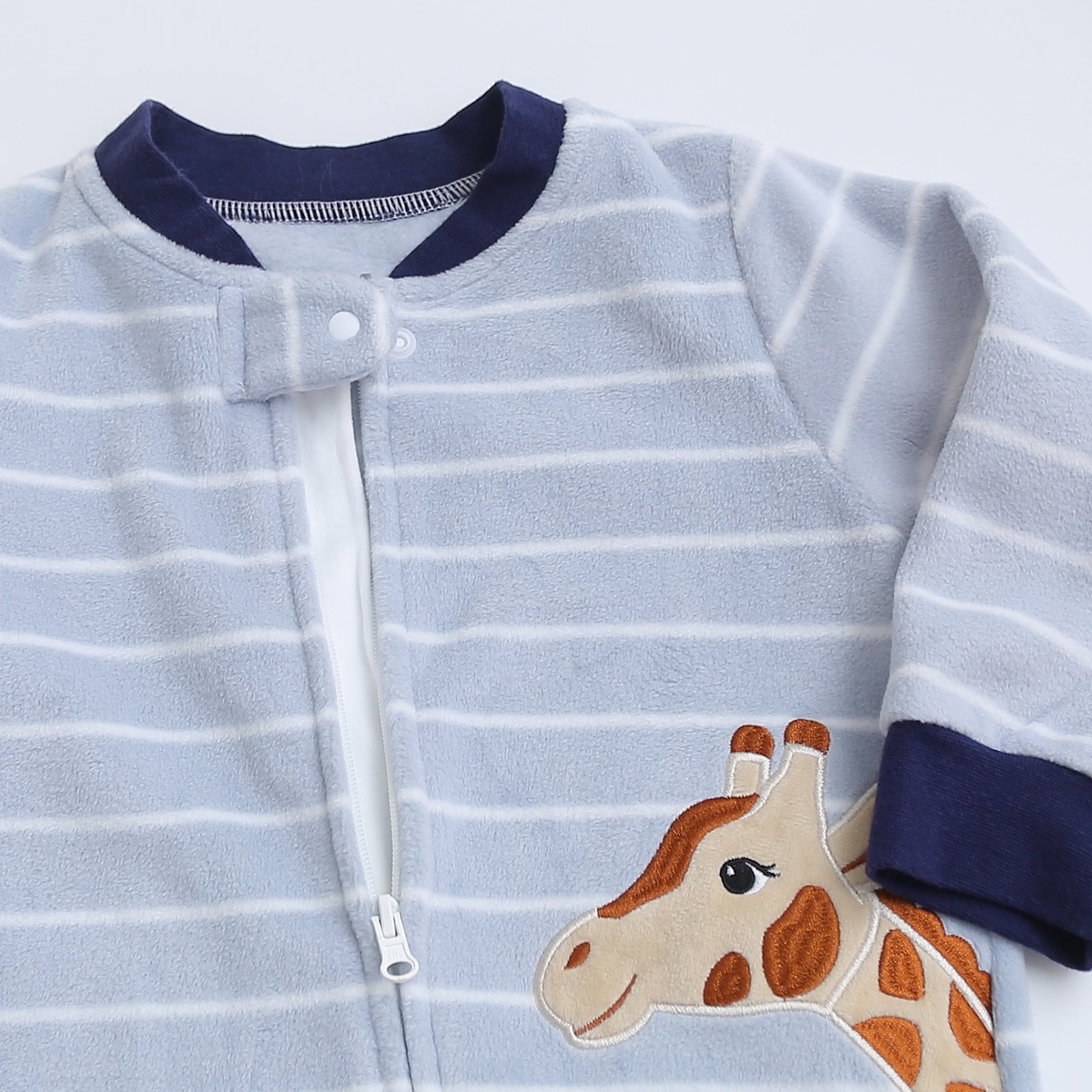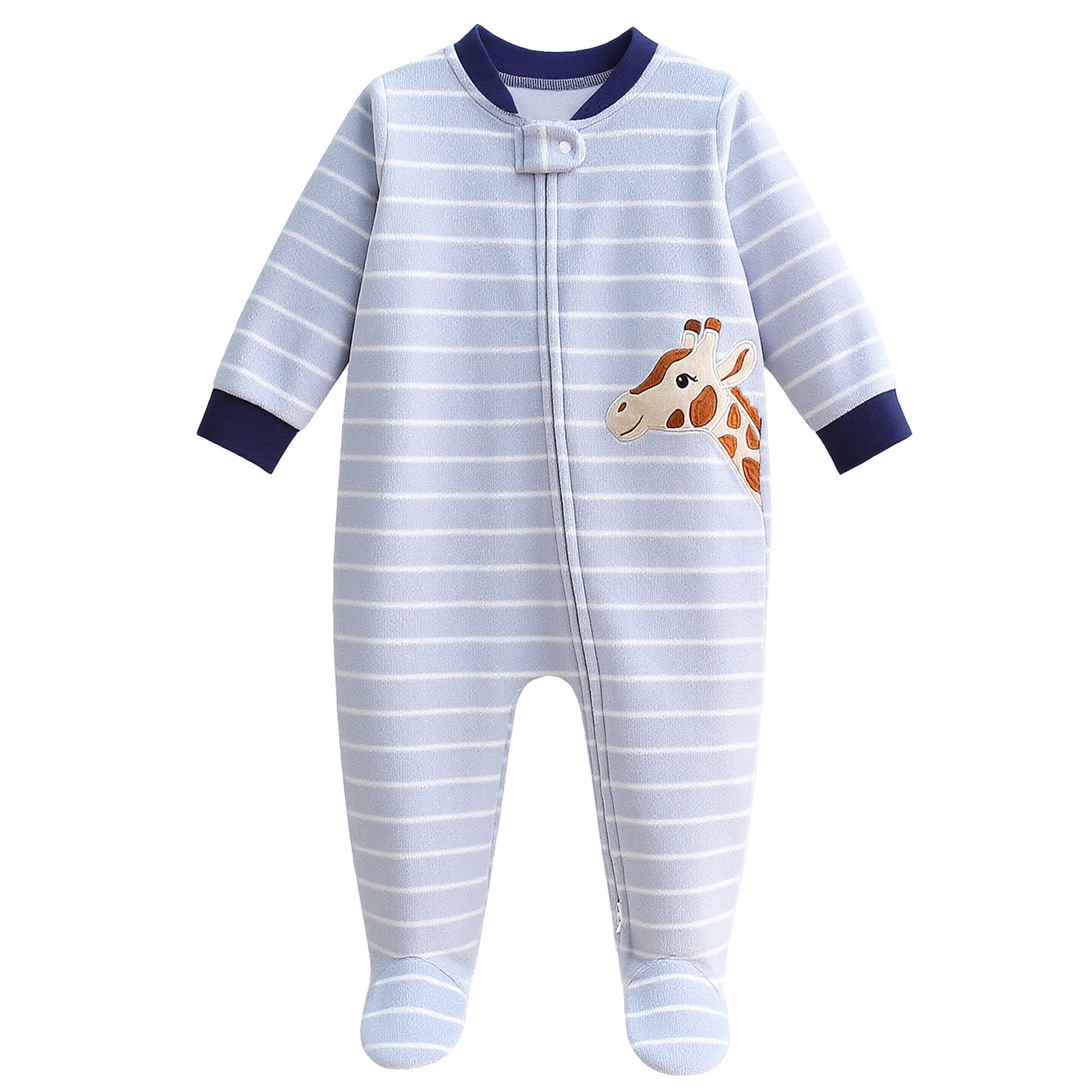 Keep your little one snug and adorable in this charming giraffe fleece overall. Featuring soft light blue and white horizontal stripes and a sweet embroidered giraffe patch, this cozy sleeper is both practical and irresistibly cute. Made from premium fleece, it provides warmth and comfort while being gentle on your baby’s delicate skin β€” perfect for sleep or play.