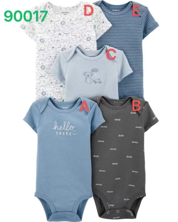 These 5-piece bodysuit sets offer a variety of playful themes and comfortable designs for everyday wear. Each set features soft cotton fabric, expandable shoulders for easy dressing, and convenient bottom snaps for quick changes.