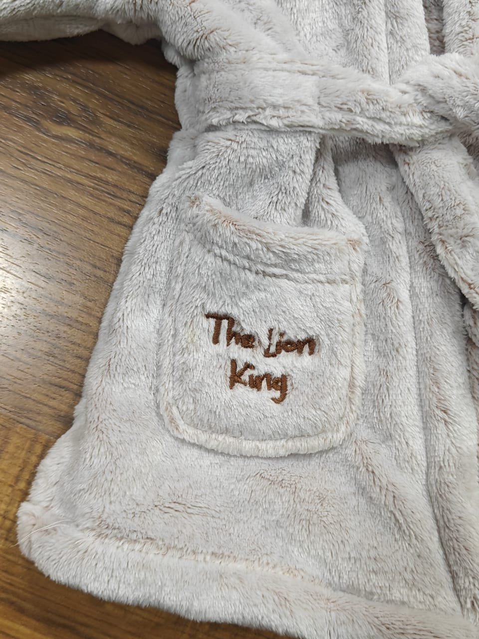 Design: Cute hooded robe in a light grey/beige color with an embroidered tie-belt.