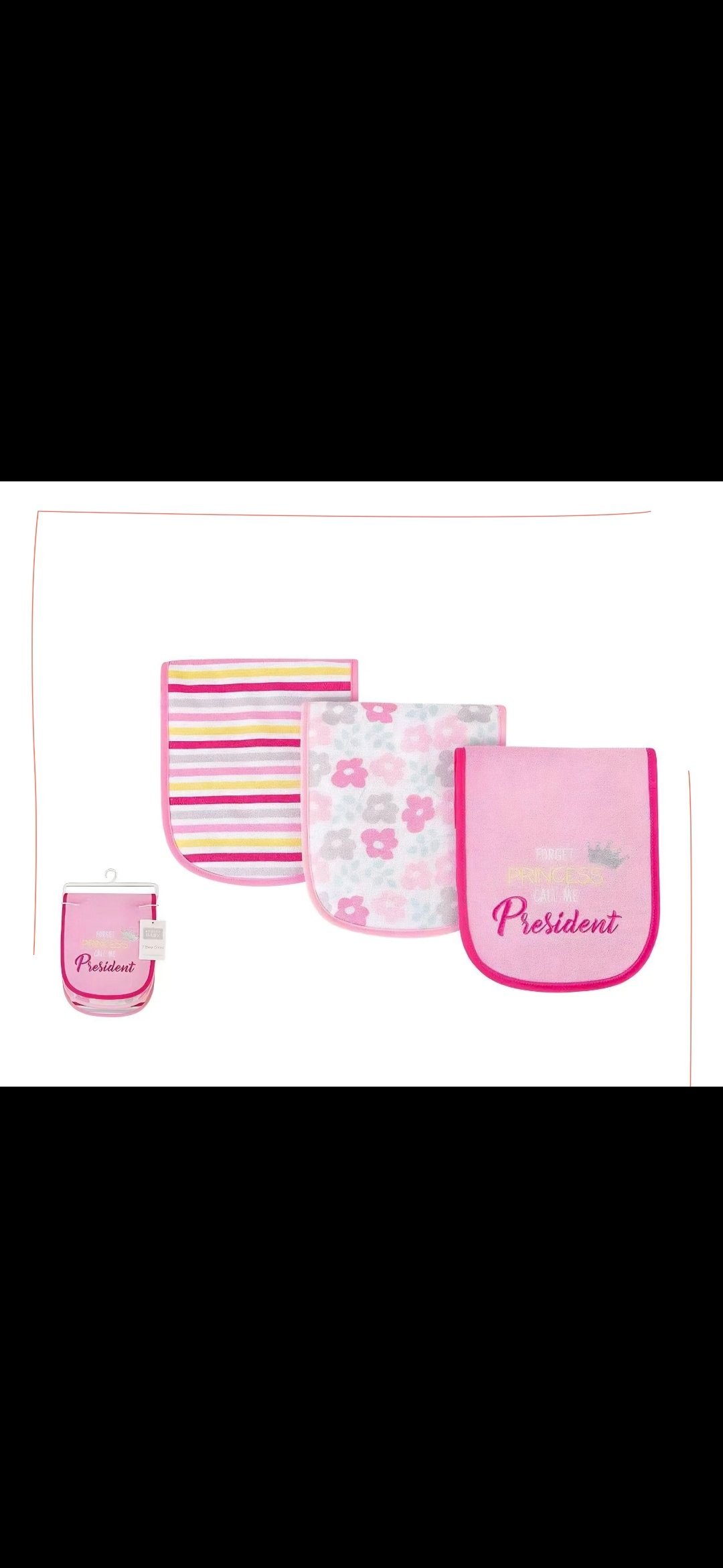 This is a set of three baby burp cloths designed for a baby girl. They feature a pink and white color palette with various patterns.