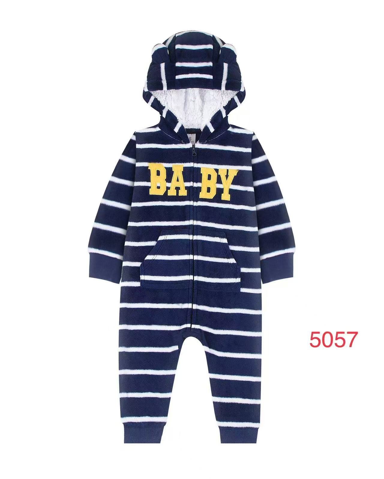 This is a warm and comfortable hooded fleece overall designed for babies, perfect for cooler weather.