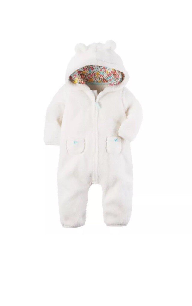 This is a sweet, plush white winter overall (or snowsuit/jumpsuit) designed for infants, perfect for keeping them warm and snug.