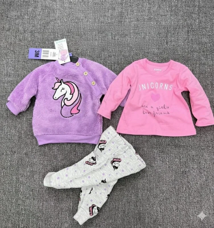 Baby Girls’ 3-Piece Winter Pajama Set – Unicorn Design (Size 3M–24M)